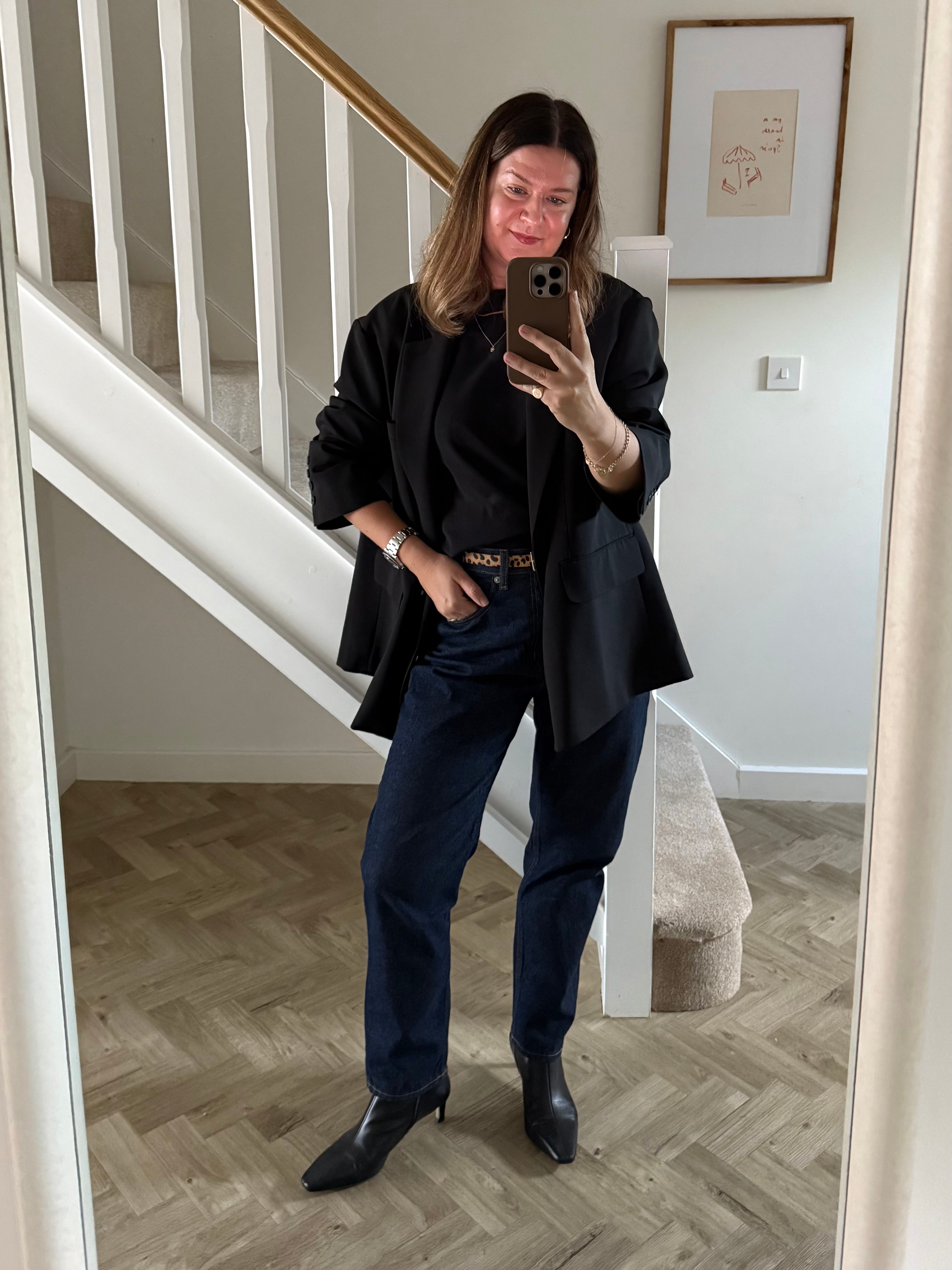 For a wardrobe piece I consider a modern classic in my repertoire, it’s mad I only actually wear this blazer in the autumn/winter months. She’s been stowed away all summer long and now it’s finally time to get the Frankie Shop black Bia blazer back into the weekly ensembles. Perfectly outsized, draping nicely off the shoulders and falling into a fluid yet structured silhouette, I defy you to find a better everyday tailored blazer. Frankie Shop does a brilliant job at making unassuming classics feel thoroughly modern. It’s the starting point of many of my outfits, and then I’ll just leave it to a simple black tee, dark slim denim and minimal black boots to do the rest. Throwing in a pop of leopard print belt just for a bit of contrast, this one is Zara, there’s a lovely option at Boden - the Iris belt.