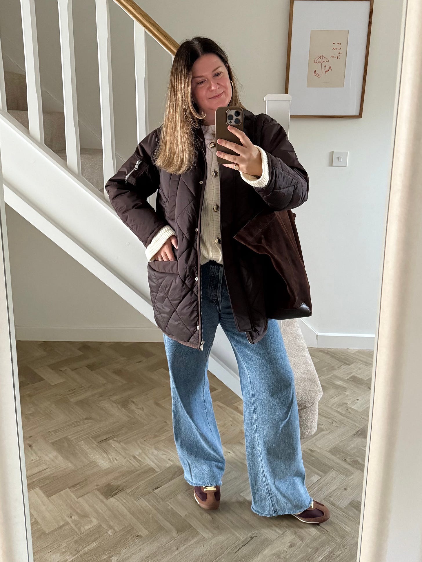 Quilted Chocolate Brown Jacket, Wide-Leg Jeans and a Trophy Cardigan